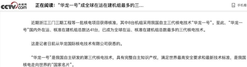 “華龍一號”是我國自主研發(fā)的第三代核電技術,具有完整自主知識產(chǎn)權,滿足世界最高安全要求和最新技術標準,是我國核電走向世界的“國家名片”。