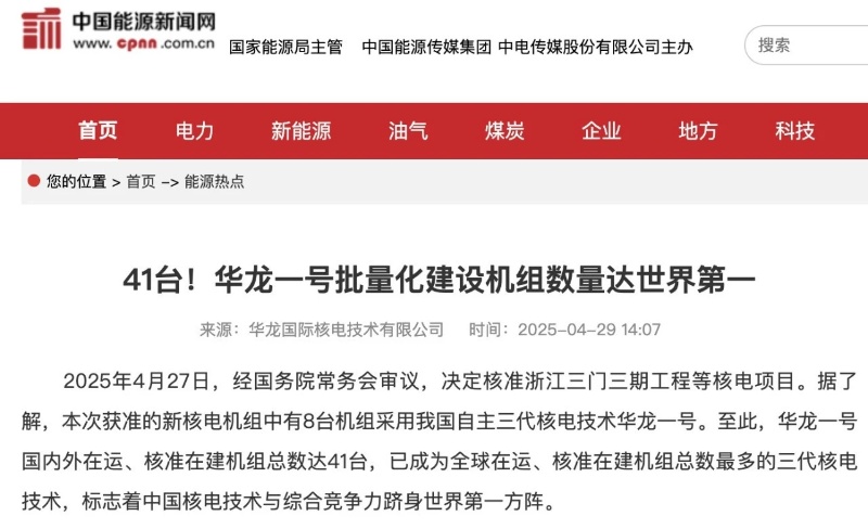 近日,經(jīng)國務院常務會審議,決定核準浙江三門三期工程等核電項目。其中,有8臺機組采用我國自主三代核電技術華龍一號。至此,華龍一號國內(nèi)外在運、核準在建機組總數(shù)達41臺,已成為全球在運、核準在建機組總數(shù)最多的三代核電技術。